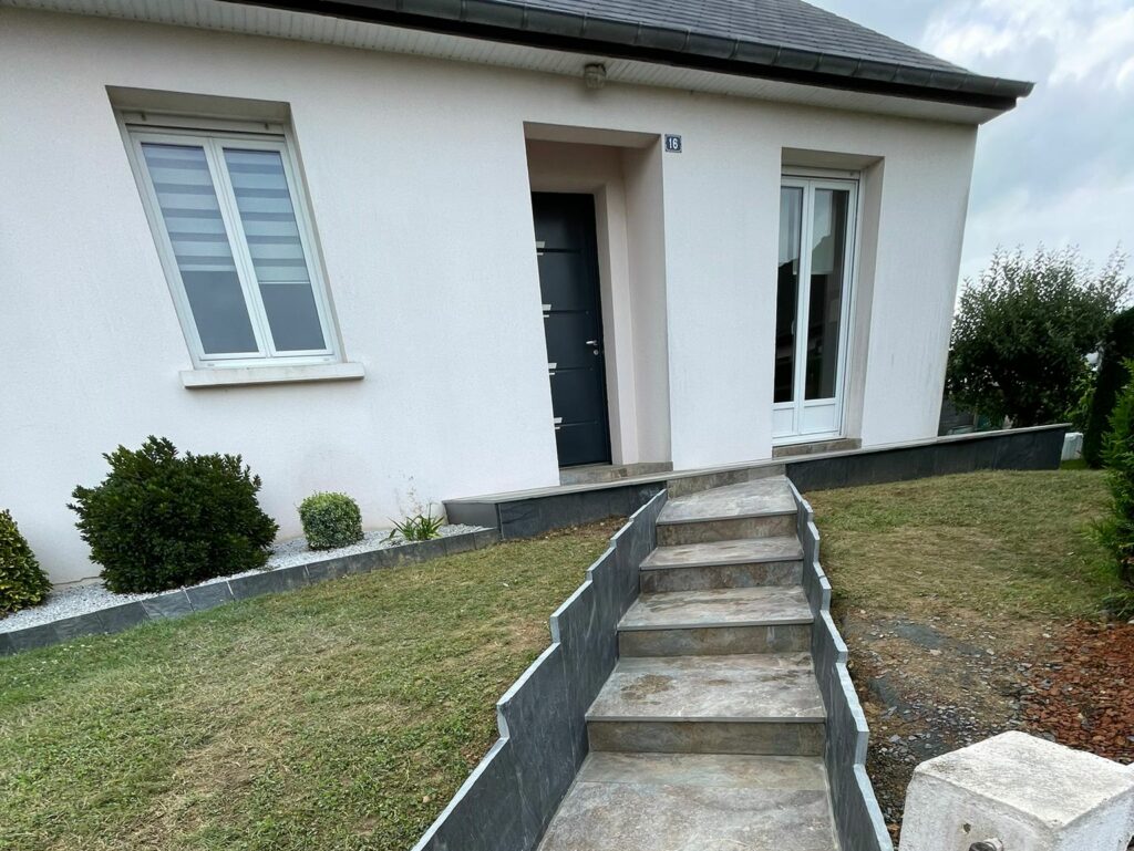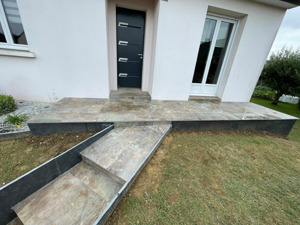 Désormais, notre client et sa famille peuvent profiter pleinement de leur extérieur grâce à ce nouvel aménagement de terrasse et d’escalier, pensé pour le confort et la durabilité. Le pavage en grès cérame offre une surface agréable à vivre, tandis que l’escalier et les bordures en ardoise facilitent les déplacements tout en apportant une réelle valeur esthétique au jardin.